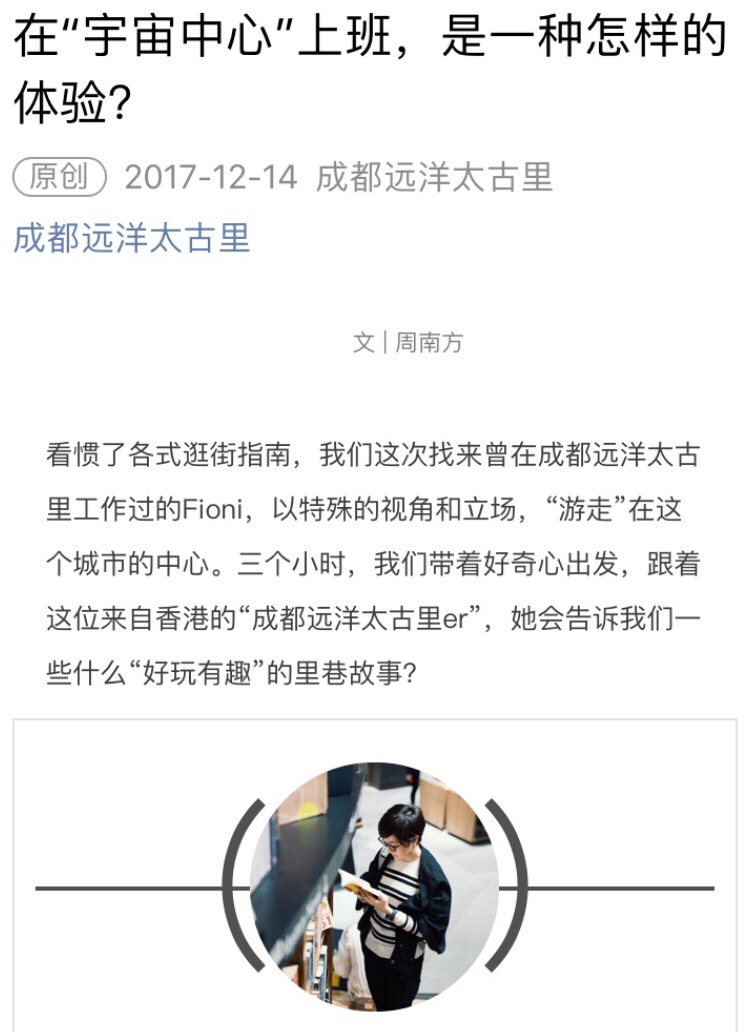 最近很開心做了一篇微信的個人訪問。訪問的字裡行間分享了我對於shopping mall和居住成都2年的經歷和熱愛,整篇訪問很立體也很真實。