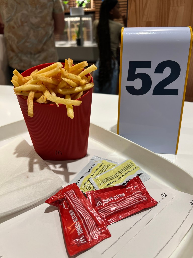 美國資本主義,隔離食咗麥當勞同埋Christy cream Donut。食麥當勞叫個細薯條要等13分鐘,真係打破我認知。但係佢哋搞錯咗,小薯條又變咗大薯條,順返條氣。現場食嘅餐具全部都係環保的,呢個唔錯。